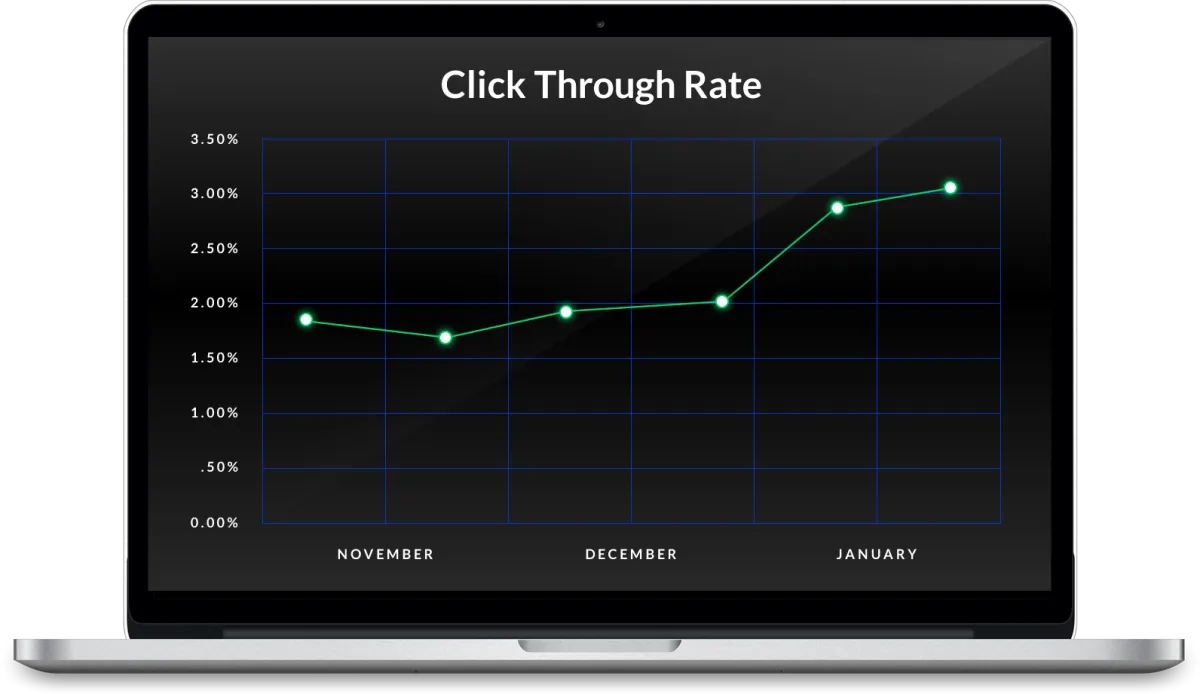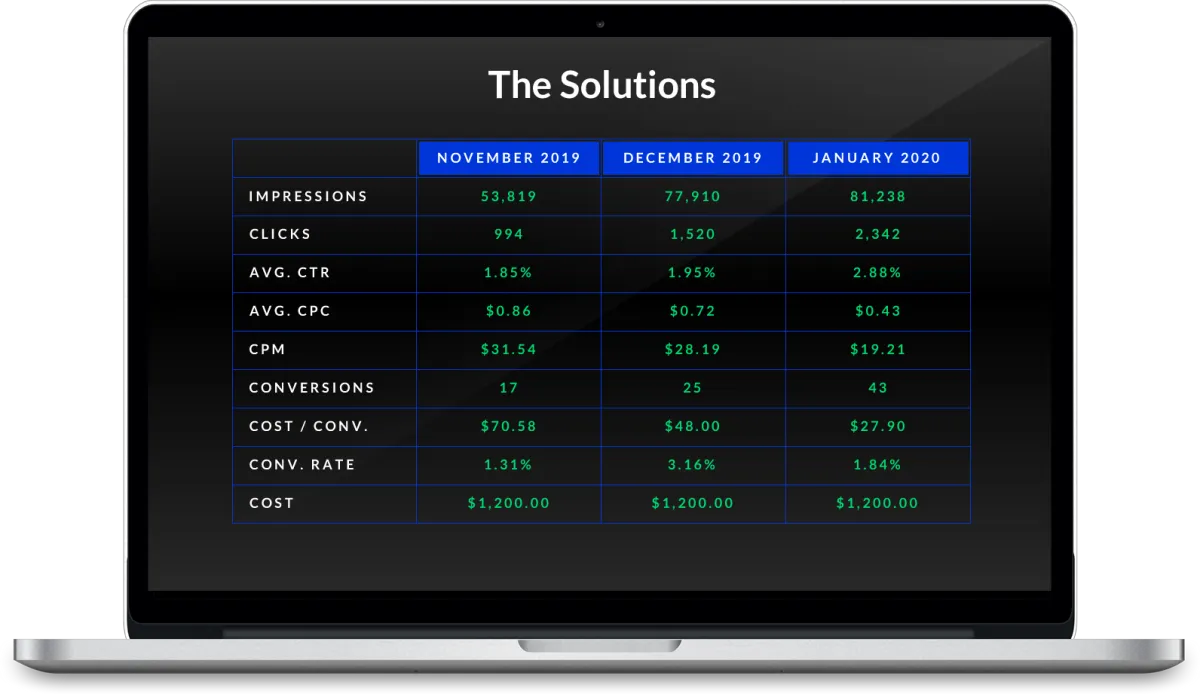 We dramatically increased the ad click-through-rate (CTR) by 55.67% in just 3 months. When we ran this campaign we made dozens of different ad variations to help single out “winning” ads based on average CTR for each ad and number of conversions it produced. We a/b tested ad variants heavily the first 30 days while the second and third month was dedicated to refining our “winning ads”.